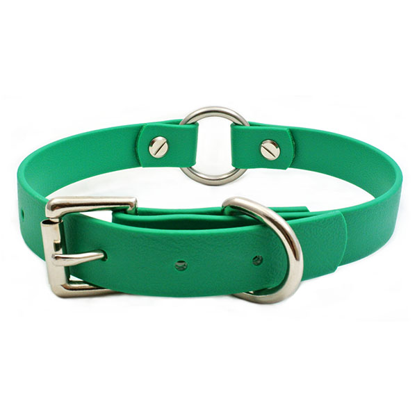 Made from genuine green BioThane this 19mm wide collar has a matt look finish with an embossed leather look texture and solid stainless steel O-ring. All rivets are screw fittings for added strength.